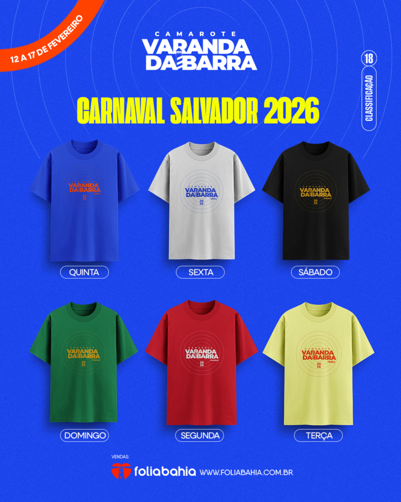Um dos grandes diferenciais do Camarote Varanda da Barra em 2026 é a identidade visual dos abadás. Cada dia da festa contará com uma cor exclusiva, trazendo variedade, estilo e a possibilidade de criar produções únicas para cada noite de folia.